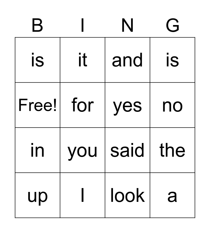 This bingo card has 16 words: I, the, and, is, in, it, said, look, Free!, for, up, is, you, no, yes and a.