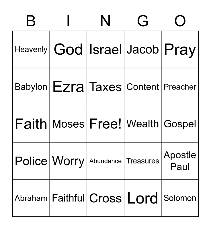This bingo card has a free space and 29 words: Abraham, Jerusalem, Moses, Exodus, Heavenly, Israel, Ezra, Worry, Wealth, Faithful, Gospel, Solomon, Cross, Lord, Preacher, David, Abundance, Police, Pray, Faith, Treasures, House, Content, Babylon, Jacob, God, Apostle Paul, Taxes and Call.