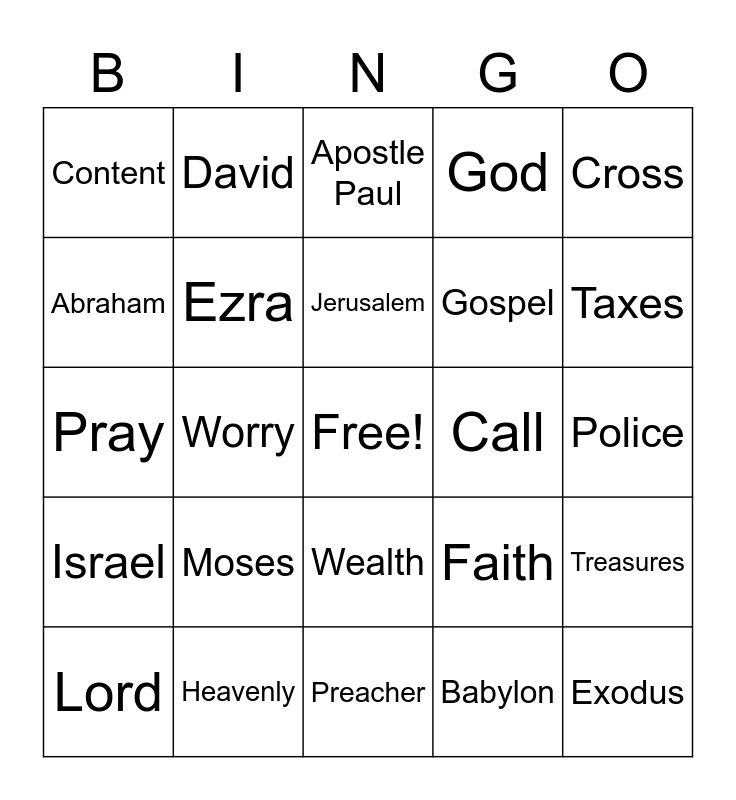 This bingo card has a free space and 29 words: Lord, Jacob, Worry, Faithful, Content, Apostle Paul, Ezra, Moses, Call, Heavenly, Police, Exodus, Preacher, Babylon, Taxes, House, Wealth, Israel, Cross, Pray, Faith, Abundance, Gospel, Abraham, God, David, Treasures, Jerusalem and Solomon.