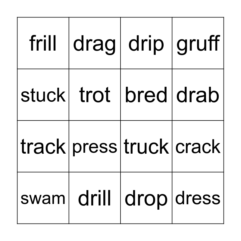 This bingo card has 28 words: black, brass, track, trip, trot, drip, drag, dress, drill, cross, truck, gruff, grass, prep, press, prod, brick, bred, drab, frog, frill, grill, swam, crack, drop, plug, stuck and slap.