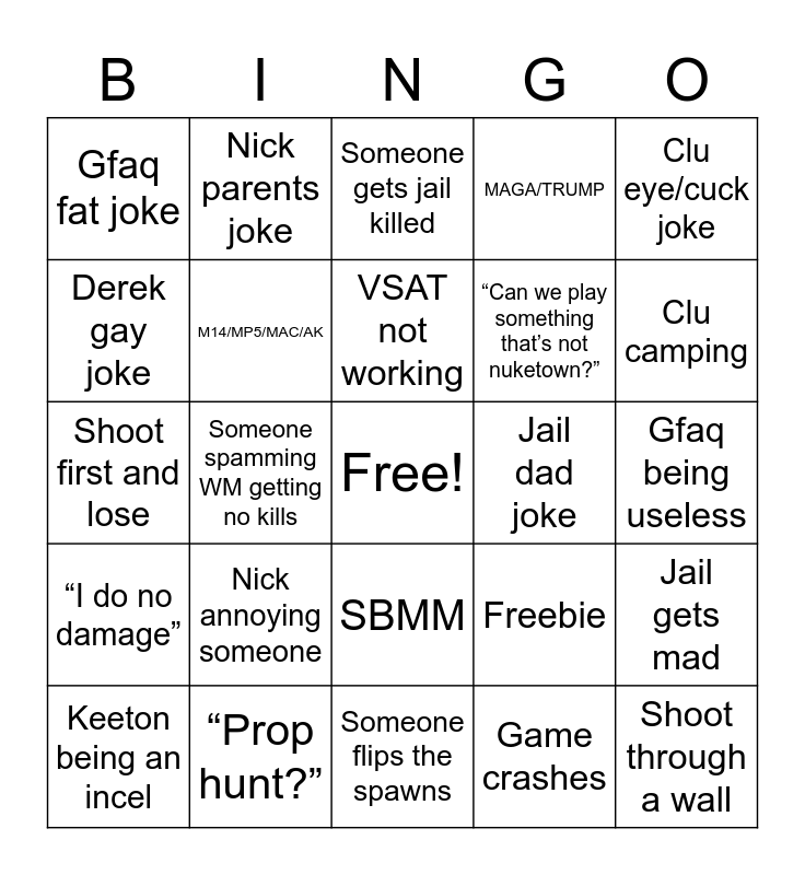 This bingo card has a free space and 25 words: Nick annoying someone, Someone flips the spawns, VSAT not working, Keeton being an incel, Clu eye/cuck joke, Gfaq fat joke, Derek gay joke, Nick parents joke, Jail dad joke, SBMM, “Can we play something that’s not nuketown?”, Shoot first and lose, Freebie, Jail gets mad, M14/MP5/MAC/AK, Derek gets play, Gfaq being useless, Someone gets jail killed, Clu camping, Someone spamming WM getting no kills, Shoot through a wall, “Prop hunt?”, “I do no damage”, MAGA/TRUMP and Game crashes.