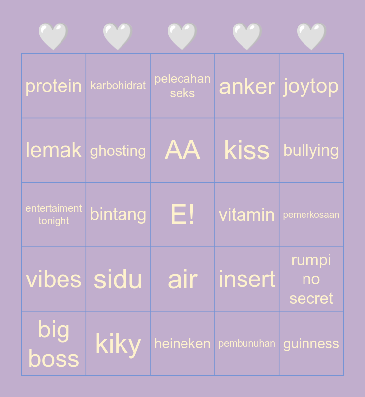 This bingo card has a free space and 24 words: sidu, kiky, AA, big boss, joytop, protein, lemak, karbohidrat, vitamin, air, kiss, entertaiment tonight, insert, rumpi no secret, ghosting, pembunuhan, pemerkosaan, pelecahan seks, bullying, bintang, guinness, vibes, anker and heineken.