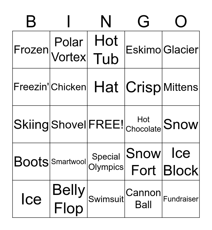 This bingo card has a free space and 61 words: Arctic, Belly Flop, Blizzard, Boots, Cannon Ball, Charity, Chicken, Cold Water, Crisp, Donation, Eskimo, Flurries, Freezin', Frigid, Frost, Frozen, Fundraiser, Glacier, Goggles, Hat, Hot Chocolate, Hot Tub, Ice, Ice Block, Igloo, Jumper Cables, Lake Winnebago, Lifeguard, Mittens, North Face, OshKosh, Pledge, Polar Bear, Polar Plunge, Polar Vortex, Scarf, Shock, Shovel, Skating, Skiing, Sledding, Smartwool, Snow, Snow Ball, Snow Fort, Snow Shoe, Snowman, Snowmobile, Snowstorm, Special Olympics, Swimsuit, Thermo Ball, Towel, Cold, Tubing, Everest, Dog Sled, Mush, Yukon, Summit and Ice Fishing.