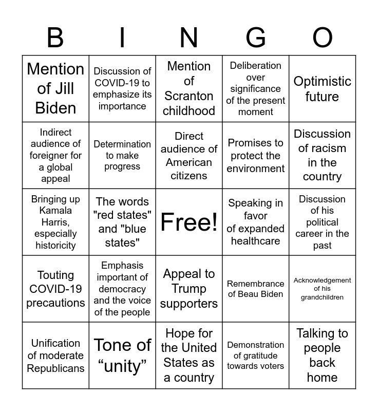 This bingo card has a free space and 24 words: Emphasis important of democracy and the voice of the people, Tone of “unity”, Direct audience of American citizens, Unification of moderate Republicans, Optimistic future, Mention of Jill Biden, Indirect audience of foreigner for a global appeal, Discussion of COVID-19 to emphasize its importance, Speaking in favor of expanded healthcare, Appeal to Trump supporters, Promises to protect the environment, Bringing up Kamala Harris, especially historicity, Remembrance of Beau Biden, Acknowledgement of his grandchildren, Determination to make progress, Demonstration of gratitude towards voters, Discussion of his political career in the past, Mention of Scranton childhood, Discussion of racism in the country, The words "red states" and "blue states", Talking to people back home, Touting COVID-19 precautions, Deliberation over significance of the present moment and Hope for the United States as a country.