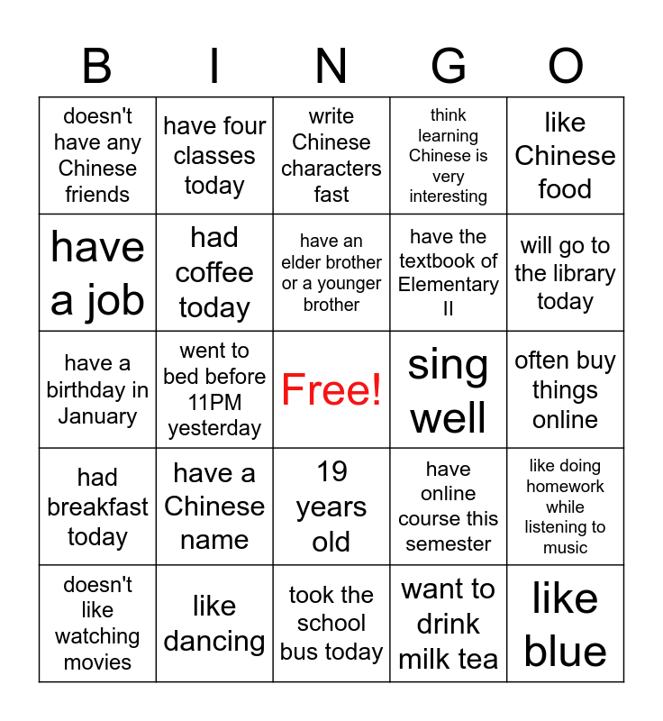 This bingo card has a free space and 24 words: have a Chinese name, like dancing, have an elder brother or a younger brother, doesn't like watching movies, like Chinese food, doesn't have any Chinese friends, have a job, have four classes today, sing well, 19 years old, have the textbook of Elementary II, have a birthday in January, have online course this semester, like doing homework while listening to music, had coffee today, want to drink milk tea, often buy things online, write Chinese characters fast, will go to the library today, went to bed before 11PM yesterday, like blue, had breakfast today, think learning Chinese is very interesting and took the school bus today.