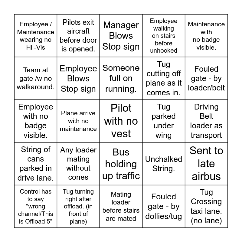 This bingo card has a free space and 29 words: Control has to say "wrong channel/This is Offload 5", Maintenance overshoots teather, Plane arrive with no maintenance, No honking when stops (TUG), Employee / Maintenance wearing no Hi -Vis, Manager Blows Stop sign, Employee Blows Stop sign, Any loader mating without cones, Tug parked under wing, Tug turning right after offload. (in front of plane), Driving Belt loader as transport, Tug Crossing taxi lane. (no lane), Mating loader before stairs are mated, Fouled gate - by dollies/tug, Fouled gate - by loader/belt, Dropped Can, Bus holding up traffic, String of cans parked in drive lane., Maintenance with no badge visible., Employee with no badge visible., Unchalked String., Offload standing between stairs and plane after brakes released., Tug cutting off plane as it comes in., Team at gate /w no walkaround., Employee walking on stairs before unhooked, Pilots exit aircraft before door is opened., Sent to late airbus, Someone full on running. and Team mates stairs instead. too late.