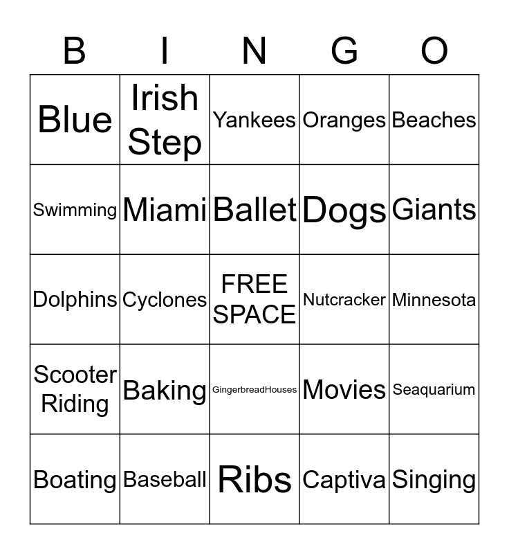 This bingo card has a free space and 24 words: Baking, Baseball, Ballet, Boating, Beaches, Blue, Swimming, Irish Step, Nutcracker, GingerbreadHouses, Dogs, Dolphins, Movies, Seaquarium, Miami, Captiva, Minnesota, Yankees, Giants, Cyclones, Singing, Scooter Riding, Oranges and Ribs.