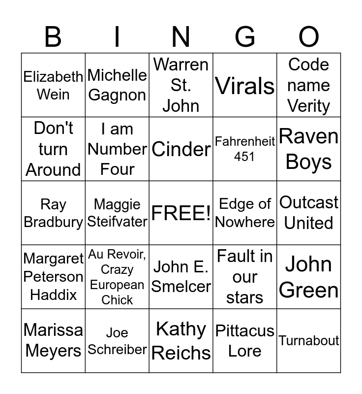 This bingo card has a free space and 24 words: Au Revoir, Crazy European Chick, Joe Schreiber, Cinder, Marissa Meyers, Code name Verity, Elizabeth Wein, Don't turn Around, Michelle Gagnon, Edge of Nowhere, John E. Smelcer, Fahrenheit 451, Ray Bradbury, Fault in our stars, John Green, I am Number Four, Pittacus Lore, Outcast United, Warren St. John, Raven Boys, Maggie Steifvater, Turnabout, Margaret Peterson Haddix, Virals and Kathy Reichs.