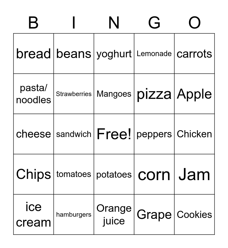 This bingo card has a free space and 24 words: tomatoes, hamburgers, Mangoes, ice cream, carrots, bread, pasta/ noodles, beans, peppers, potatoes, pizza, cheese, corn, Jam, Strawberries, Grape, Chicken, yoghurt, Apple, sandwich, Cookies, Chips, Lemonade and Orange juice.