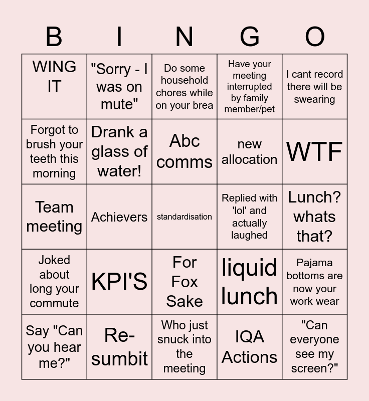 This bingo card has a free space and 25 words: Say "Can you hear me?", KPI'S, Abc comms, IQA Actions, WTF, WING IT, "Sorry - I was on mute", Do some household chores while on your brea, new allocation, Pajama bottoms are now your work wear, Team meeting, Drank a glass of water!, liquid lunch, "Can everyone see my screen?", Forgot to brush your teeth this morning, Re-sumbit, Who just snuck into the meeting, Have your meeting interrupted by family member/pet, Lunch? whats that?, Joked about long your commute, Achievers, For Fox Sake, Replied with 'lol' and actually laughed, I cant record there will be swearing and Give a coworker a shout out in huddle.