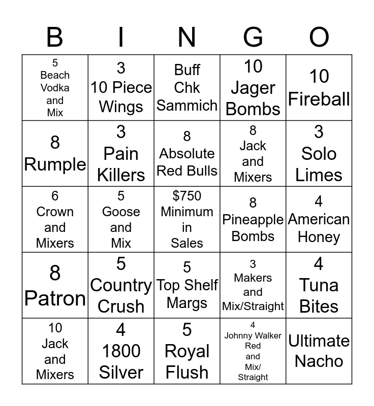 This bingo card has a free space and 24 words: 5 Country Crush, 4 1800 Silver, 8 Absolute Red Bulls, 10 Jack and Mixers, 10 Fireball, 5 Beach Vodka and Mix, 8 Rumple, 3 10 Piece Wings, 8 Pineapple Bombs, 5 Top Shelf Margs, 8 Jack and Mixers, 6 Crown and Mixers, 3 Makers and Mix/Straight, 4 Tuna Bites, 3 Pain Killers, 4 Johnny Walker Red and Mix/ Straight, 4 American Honey, Buff Chk Sammich, 3 Solo Limes, 5 Goose and Mix, Ultimate Nacho, 8 Patron, 10 Jager Bombs and 5 Royal Flush.