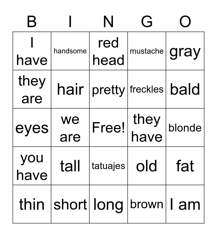 This bingo card has a free space and 24 words: tall, short, pretty, thin, gray, I have, they are, handsome, they have, tatuajes, freckles, eyes, old, fat, hair, brown, blonde, red head, bald, we are, I am, you have, mustache and long.