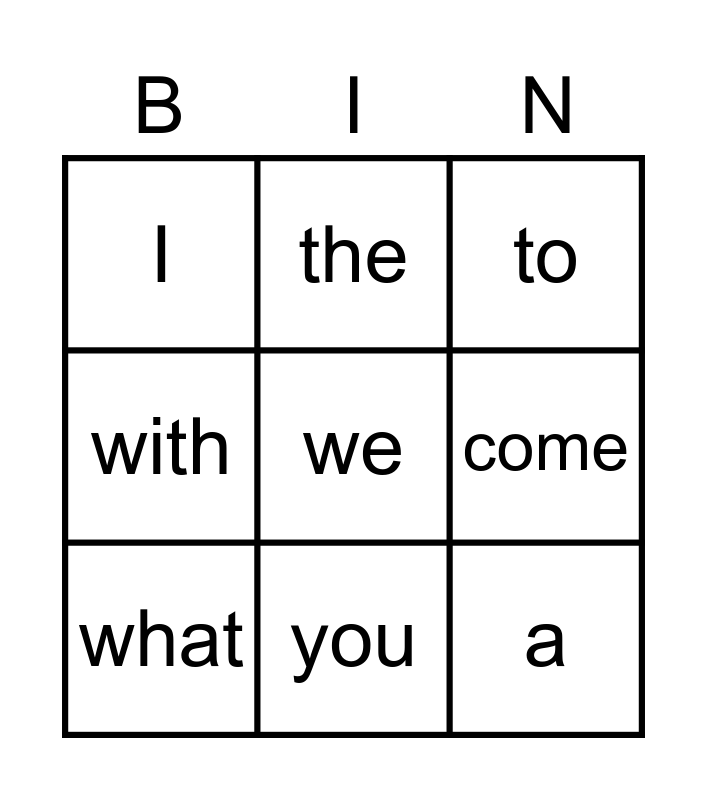 This bingo card has 16 words: now, and, to, I, a, the, like, see, we, come, me, with, my, you, what and are.