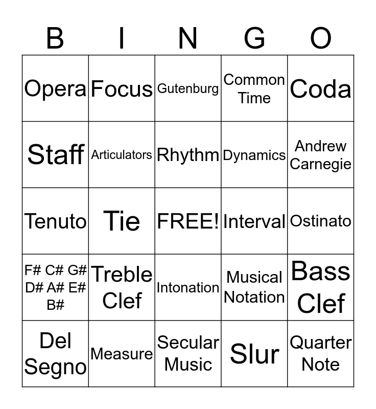This bingo card has a free space and 24 words: Treble Clef, Measure, Rhythm, Del Segno, Coda, Opera, Staff, Focus, Interval, Intonation, Dynamics, Tenuto, Musical Notation, Bass Clef, Articulators, Slur, Ostinato, Gutenburg, Andrew Carnegie, Tie, Quarter Note, F# C# G# D# A# E# B#, Common Time and Secular Music.