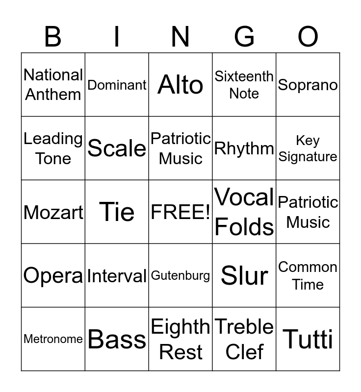 This bingo card has a free space and 24 words: Interval, Bass, Patriotic Music, Metronome, Soprano, National Anthem, Leading Tone, Dominant, Vocal Folds, Gutenburg, Rhythm, Mozart, Slur, Common Time, Scale, Treble Clef, Patriotic Music, Alto, Key Signature, Tie, Tutti, Opera, Sixteenth Note and Eighth Rest.