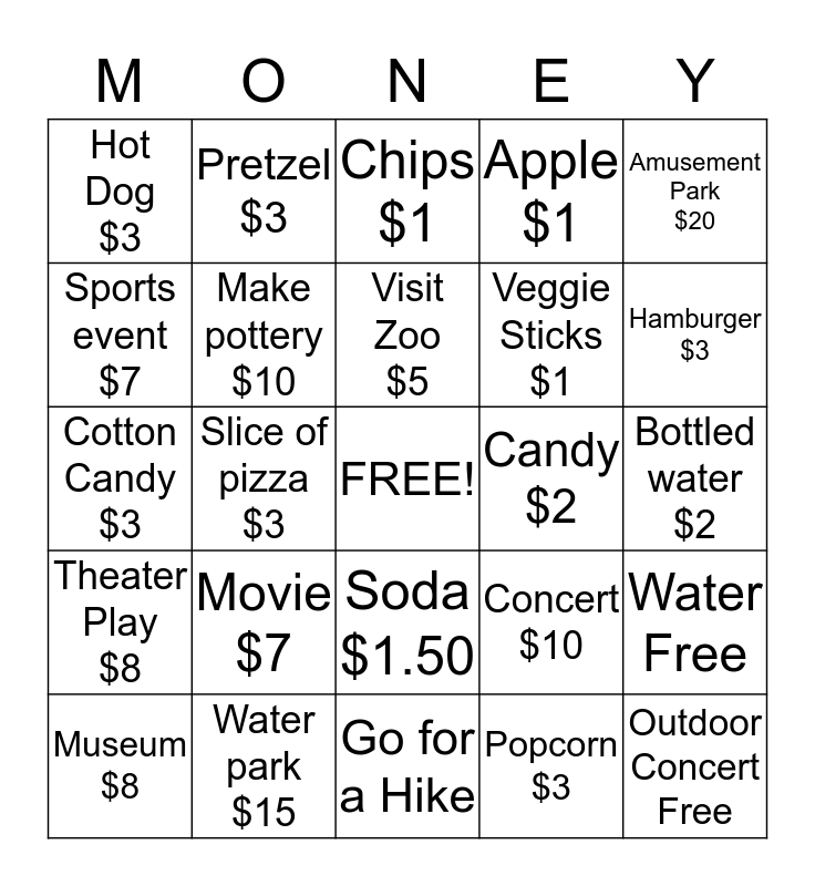 This bingo card has a free space and 24 words: Movie $7, Water park $15, Visit Zoo $5, Museum $8, Amusement Park $20, Hot Dog $3, Sports event $7, Pretzel $3, Candy $2, Soda $1.50, Veggie Sticks $1, Cotton Candy $3, Concert $10, Water Free, Make pottery $10, Popcorn $3, Bottled water $2, Chips $1, Hamburger $3, Slice of pizza $3, Outdoor Concert Free, Theater Play $8, Apple $1 and Go for a Hike.