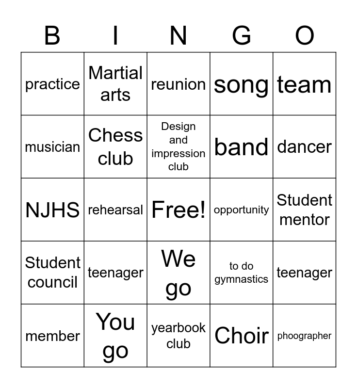 This bingo card has a free space and 34 words: Fishing Club, Choir, Robotics club, Ski club, Student council, Chess club, team, member, Martial arts, to record, Design and impression club, reunion, I go, Art club, opportunity, dancer, You go, NJHS, teenager, to do gymnastics, We go, To win, practice, Student mentor, yearbook club, phoographer, song, orchestra, band, musician, hobby, rehearsal, teenager and the team lost.
