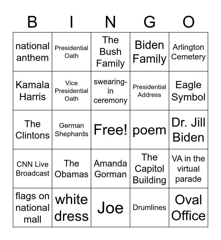 This bingo card has a free space and 24 words: The Obamas, white dress, swearing-in ceremony, flags on national mall, Arlington Cemetery, national anthem, Kamala Harris, Presidential Oath, poem, Amanda Gorman, Presidential Address, The Clintons, The Capitol Building, VA in the virtual parade, Vice Presidential Oath, Drumlines, Dr. Jill Biden, The Bush Family, Eagle Symbol, German Shephards, Oval Office, CNN Live Broadcast, Biden Family and Joe.