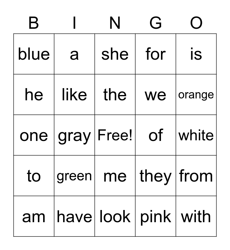 This bingo card has a free space and 38 words: purple, yellow, one, like, from, green, the, see, is, we, gray, for, with, white, he, to, my, she, little, of, blue, have, orange, am, red, look, four, I, black, brown, into, me, pink, a, into, they, one and you.