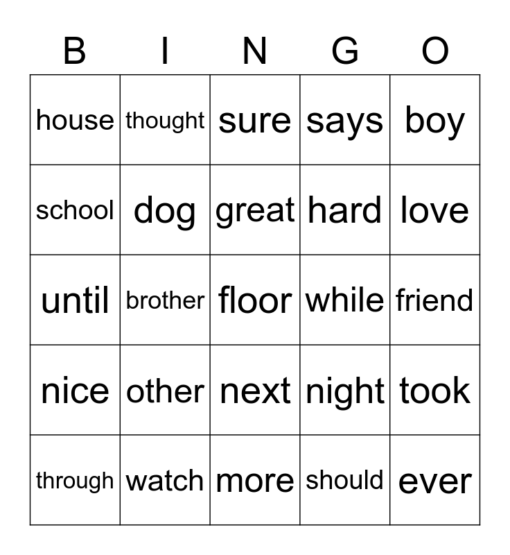 This bingo card has 25 words: other, more, great, through, boy, house, school, thought, while, next, hard, until, night, took, dog, ever, friend, sure, love, brother, floor, watch, nice, says and should.