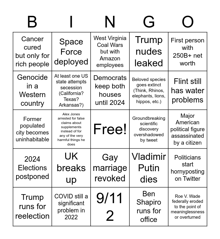 This bingo card has a free space and 24 words: UK breaks up, COVID still a significant problem in 2022, Democrats keep both houses until 2024, Trump runs for reelection, First person with 250B+ net worth, Cancer cured but only for rich people, Genocide in a Western country, Space Force deployed, Groundbreaking scientific discovery overshadowed by tweet, Gay marriage revoked, Beloved species goes extinct (Think, Rhinos, elephants, lions, hippos, etc.), Former populated city becomes uninhabitable, Vladimir Putin dies, Politicians start hornyposting on Twitter, At least one US state attempts secession (California? Texas? Arkansas?), Ben Shapiro runs for office, Major American political figure assassinated by a citizen, West Virginia Coal Wars but with Amazon employees, Flint still has water problems, Alex Jones arrested for false claims about supplements instead of for any of the very harmful things he does, Roe V. Wade federally eroded to the point of meaninglessness or overturned, 2024 Elections postponed, Trump nudes leaked and 9/11 2.