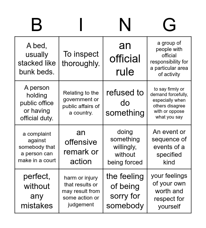 This bingo card has 20 words: An event or sequence of events of a specified kind, A small mistake in an agreement., an official rule, something that someone must do, perfect, without any mistakes, A person holding public office or having official duty., harm or injury that results or may result from some action or judgement, A bed, usually stacked like bunk beds., a complaint against somebody that a person can make in a court, To inspect thoroughly., an offensive remark or action, doing something willingly, without being forced, Relating to the government or public affairs of a country., your feelings of your own worth and respect for yourself, refused to do something, the unfair treatment of someone because of his or her race, to say firmly or demand forcefully, especially when others disagree with or oppose what you say, a group of people with official responsibility for a particular area of activity, the feeling of being sorry for somebody and the laws which has been made official.