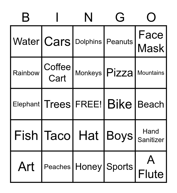 This bingo card has a free space and 24 words: Taco, Peaches, Monkeys, Art, Face Mask, Water, Rainbow, Cars, Bike, Hat, Pizza, Elephant, Boys, Hand Sanitizer, Coffee Cart, Sports, Beach, Dolphins, Mountains, Trees, A Flute, Fish, Peanuts and Honey.