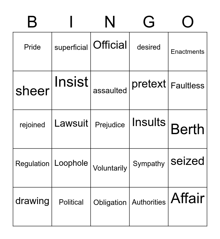 This bingo card has 30 words: Political, Declined, Lawsuit, Racism, Pride, Official, Insist, Voluntarily, Insults, Obligation, Berth, Prejudice, Authorities, Affair, Faultless, Examine, Sympathy, Regulation, Loophole, Enactments, rejoined, cowardice, superficial, pretext, sheer, desired, seized, drawing, assaulted and muttered.