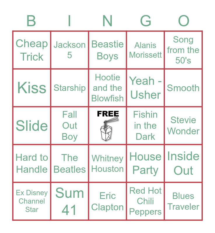 This bingo card has a free space and 29 words: Ex Disney Channel Star, Summer of 69, Fall Out Boy, Cars Soundtrack, Cheap Trick, Beastie Boys, Starship, The Beatles, Fishin in the Dark, Sum 41, Stevie Wonder, Blues Traveler, Eric Clapton, Red Hot Chili Peppers, Smooth, Green Day, Whitney Houston, Hard to Handle, Song from the 50's, Slide, House Party, Hair Band with Bret Michaels, Yeah - Usher, Kiss, Alanis Morissett, Jackson 5, Inside Out, Hootie and the Blowfish and Aint No Mountain High Enough.