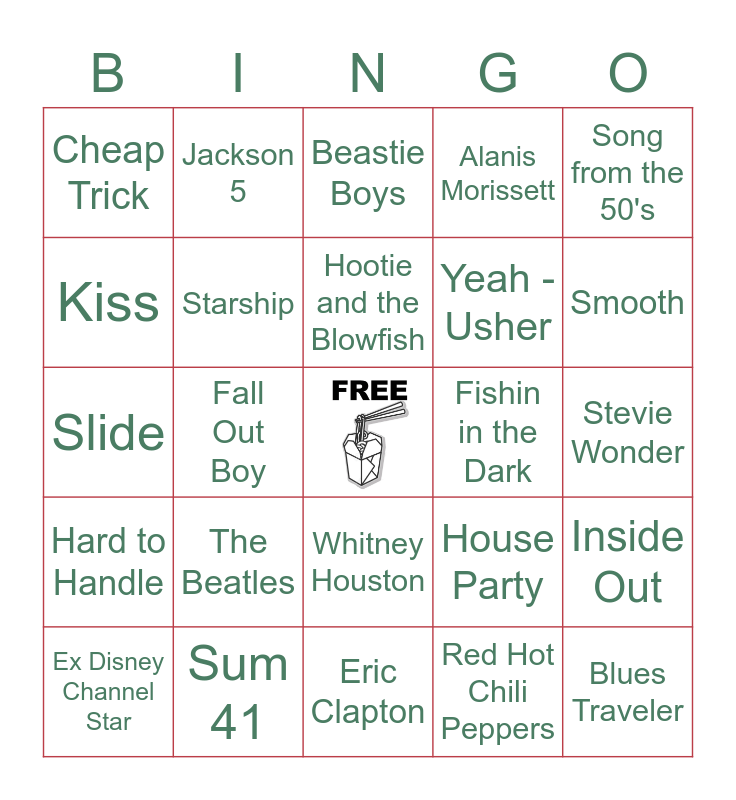 This bingo card has a free space and 29 words: Ex Disney Channel Star, Summer of 69, Fall Out Boy, Cars Soundtrack, Cheap Trick, Beastie Boys, Starship, The Beatles, Fishin in the Dark, Sum 41, Stevie Wonder, Blues Traveler, Eric Clapton, Red Hot Chili Peppers, Smooth, Green Day, Whitney Houston, Hard to Handle, Song from the 50's, Slide, House Party, Hair Band with Bret Michaels, Yeah - Usher, Kiss, Alanis Morissett, Jackson 5, Inside Out, Hootie and the Blowfish and Aint No Mountain High Enough.