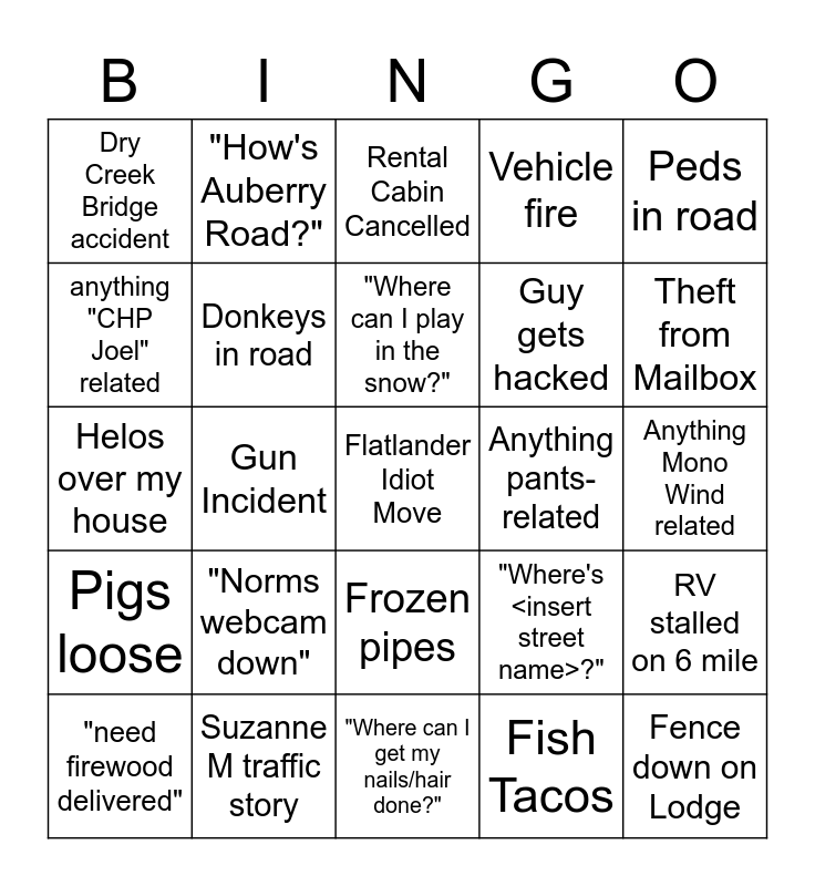This bingo card has a free space and 24 words: "Norms webcam down", Suzanne M traffic story, "Where can I play in the snow?", "need firewood delivered", Peds in road, Dry Creek Bridge accident, anything "CHP Joel" related, "How's Auberry Road?", Anything pants-related, Frozen pipes, Guy gets hacked, Helos over my house, "Where's <insert street name>?", RV stalled on 6 mile, Donkeys in road, Fish Tacos, Anything Mono Wind related, Rental Cabin Cancelled, Theft from Mailbox, Gun Incident, Fence down on Lodge, Pigs loose, Vehicle fire and "Where can I get my nails/hair done?".