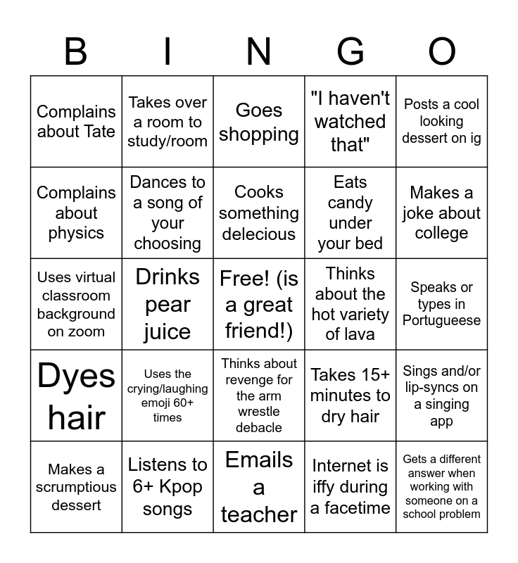 This bingo card has a free space and 24 words: Uses the crying/laughing emoji 60+ times, Listens to 6+ Kpop songs, Cooks something delecious, Makes a scrumptious dessert, Posts a cool looking dessert on ig, Complains about Tate, Complains about physics, Takes over a room to study/room, Thinks about the hot variety of lava, Thinks about revenge for the arm wrestle debacle, Eats candy under your bed, Uses virtual classroom background on zoom, Takes 15+ minutes to dry hair, Sings and/or lip-syncs on a singing app, Dances to a song of your choosing, Internet is iffy during a facetime, Speaks or types in Portugueese, Goes shopping, Makes a joke about college, Drinks pear juice, Gets a different answer when working with someone on a school problem, Dyes hair, "I haven't watched that" and Emails a teacher.
