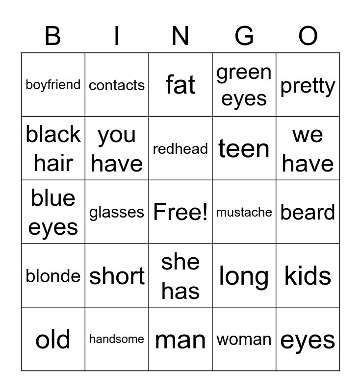 This bingo card has a free space and 34 words: tall, woman, I have, gray eyes, blonde, you have, pretty, old, contacts, tattoos, redhead, fat, eyes, thin, mustache, we have, handsome, blue eyes, short, long, she has, short, boyfriend, beard, man, eyes, green eyes, they have, teen, black hair, baby, glasses, kids and brown hair.