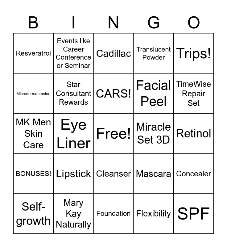 This bingo card has a free space and 34 words: Extra Income, Flexibility, No territories!, Tax deductions, BONUSES!, Star Consultant Rewards, Trips!, Self-growth, Events like Career Conference or Seminar, Profit level, CARS!, Cadillac, Girlfriend time, Access to SPA quality products @ 1/2 price, Miracle Set 3D, TimeWise Repair Set, Mary Kay Naturally, MK Men Skin Care, Lipstick, Mascara, Cleanser, Moisturizer, Resveratrol, Retinol, Foundation, SPF, Translucent Powder, Charcoal Mask, Facial Peel, Microdermabrasion, Eye Shadow, Eye Liner, Concealer and Hydrogel Eye Patches.