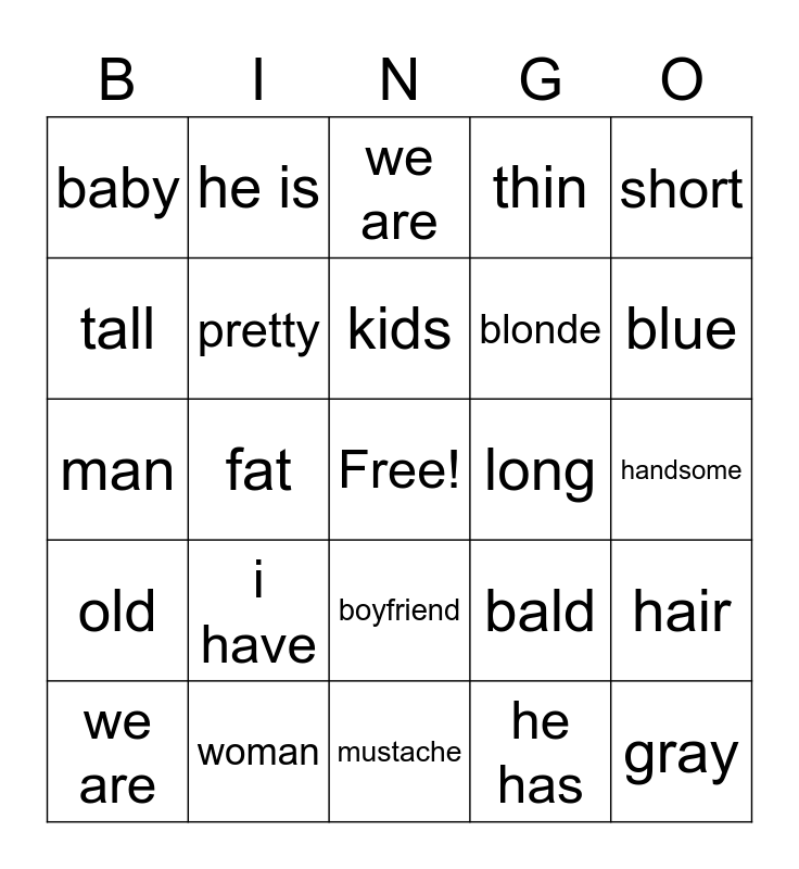 This bingo card has a free space and 24 words: i have, woman, kids, we are, short, baby, tall, he is, long, boyfriend, blonde, man, bald, hair, pretty, he has, handsome, we are, blue, fat, gray, old, thin and mustache.