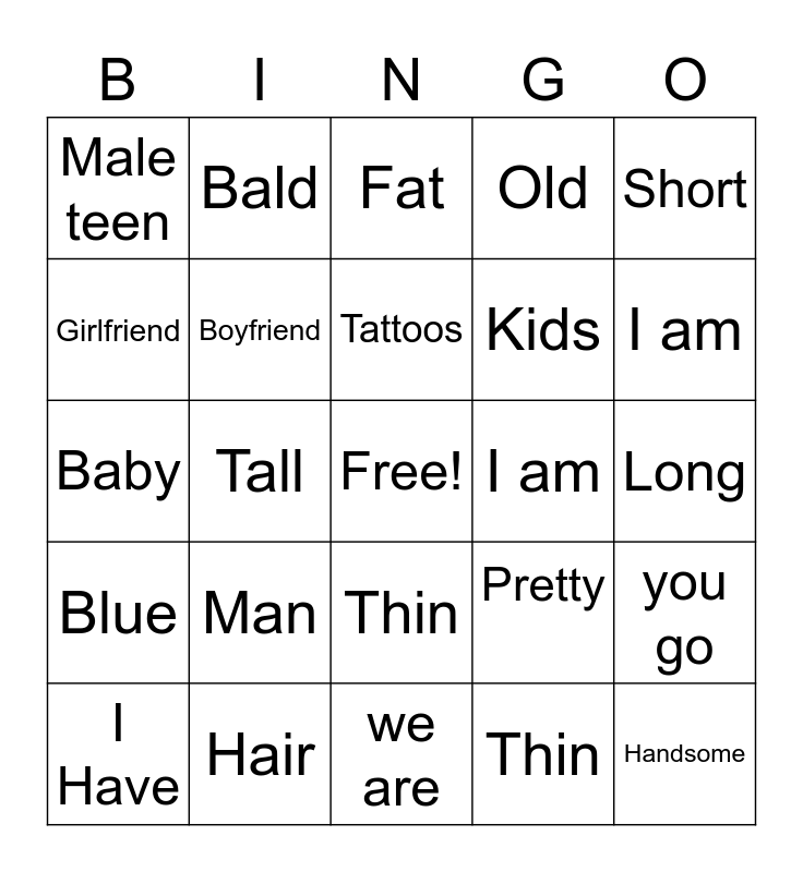 This bingo card has a free space and 24 words: Man, Hair, Tattoos, I Have, Short, Male teen, Girlfriend, Bald, I am, Thin, Kids, Baby, Pretty, you go, Boyfriend, Thin, Long, Fat, I am, Tall, Handsome, Blue, Old and we are.