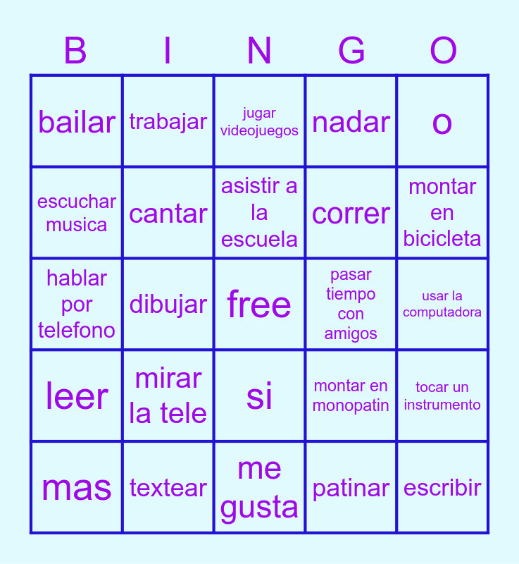 This bingo card has a free space and 24 words: mirar la tele, textear, asistir a la escuela, mas, o, bailar, escuchar musica, trabajar, pasar tiempo con amigos, si, correr, hablar por telefono, montar en monopatin, tocar un instrumento, cantar, patinar, usar la computadora, jugar videojuegos, montar en bicicleta, dibujar, escribir, leer, nadar and me gusta.