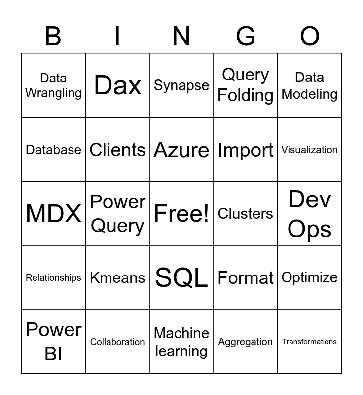This bingo card has a free space and 26 words: SQL, Aggregation, Azure, Collaboration, Data Modeling, Data Wrangling, Database, Dax, Dev Ops, Format, Import, MDX, Optimize, Power BI, Power Query, Query Editor, Query Folding, Relationships, Synapse, Transformations, Visualization, Machine learning, Clusters, Kmeans, Clients and Unsupervised learning.