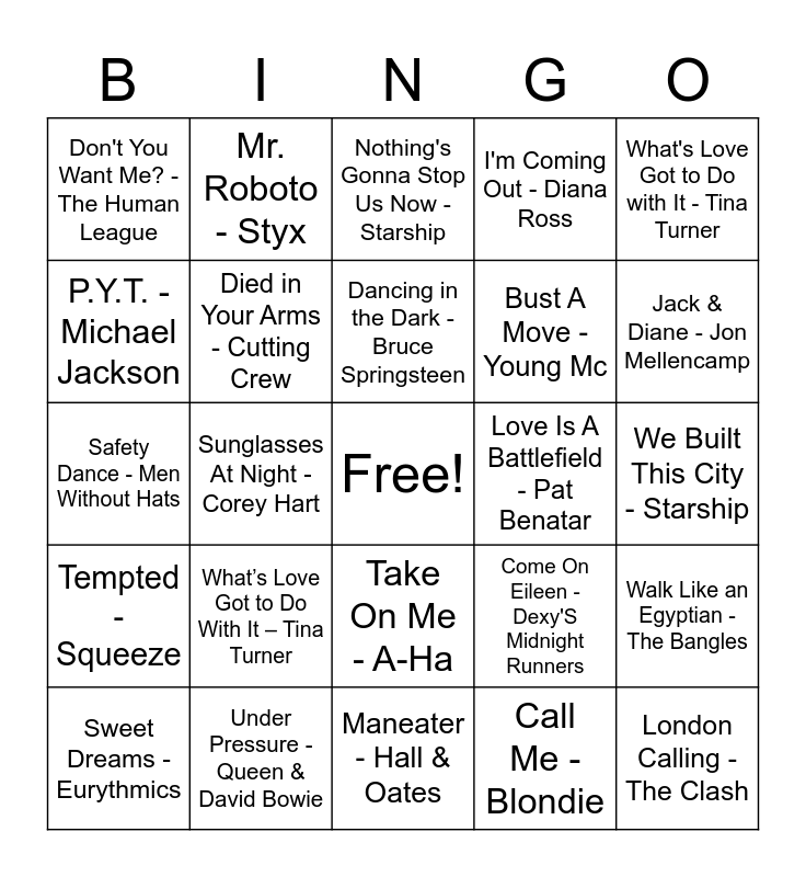 This bingo card has a free space and 55 words: All Night Long - Lionel Richie, Sweet Dreams - Eurythmics, Kiss - Prince, Don't You Want Me? - The Human League, Maneater - Hall & Oates, Faith - George Michael, Died in Your Arms - Cutting Crew, Let's Hear It for the Boy - Deniece Williams, Bust A Move - Young Mc, Footloose - Kenny Loggins, I'm Coming Out - Diana Ross, Who can it be now? – Men At Work, Just Can't Get Enough - Depeche Mode, Total Eclipse Of The Heart - Bonnie Tyler, Hey Mickey - Toni Basil, Red Red Wine – UB40, What's Love Got to Do with It - Tina Turner, Sunglasses At Night - Corey Hart, Time After Time - Cyndi Lauper, London Calling - The Clash, Love Is A Battlefield - Pat Benatar, Raspberry Beret - Prince, Come On Eileen - Dexy'S Midnight Runners, Nothing's Gonna Stop Us Now - Starship, Never Gonna Give You Up - Rick Astley, Dancing in the Dark - Bruce Springsteen, Call Me - Blondie, Africa – TOTO, We Built This City - Starship, Walk Like an Egyptian - The Bangles, Push It - Salt-N-Pepa, I'm So Excited - The Pointer Sisters, It Takes Two - Rob Base & DG E-Z Rock, Livin' On A Prayer - Bon Jovi, P.Y.T. - Michael Jackson, Safety Dance - Men Without Hats, La Bamba – Los Lobos, Tempted - Squeeze, Jessie's Girl - Rick Springfield, What I Like About You - The Romantics, Mr. Roboto - Styx, Tainted Love - Soft Cell, I Wanna Dance with Somebody- Whitney Houston, Walking On Sunshine - Katrina & The Waves, What’s Love Got to Do With It – Tina Turner, Under Pressure - Queen & David Bowie, Every Breath You Take - The Police, I Melt With You - Modern English, Funky Cold Medina - Tone-Loc, Jack & Diane - Jon Mellencamp, Take My Breath Away - Berlin, Money For Nothing – Dire Straits, Keep On Loving You - REO Speedwagon, Take On Me - A-Ha and It's The End Of The World As We Know It - R.E.M..