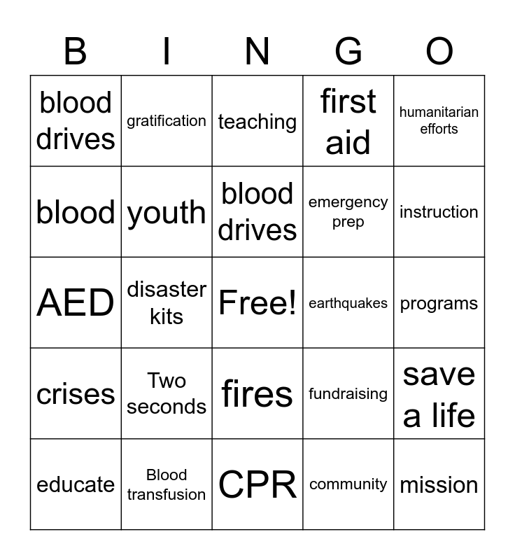 This bingo card has a free space and 24 words: Two seconds, Blood transfusion, blood drives, educate, humanitarian efforts, blood drives, blood, gratification, earthquakes, fires, emergency prep, AED, fundraising, save a life, youth, community, programs, teaching, instruction, disaster kits, mission, crises, first aid and CPR.