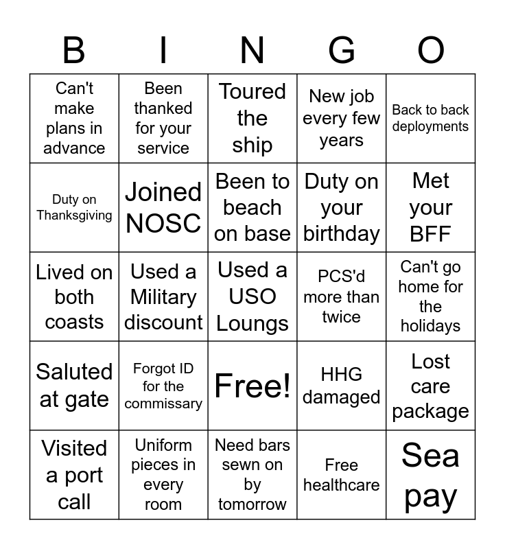 This bingo card has 26 words: Free!, Free healthcare, Been to beach on base, Uniform pieces in every room, Back to back deployments, Can't make plans in advance, Duty on Thanksgiving, Been thanked for your service, Can't go home for the holidays, HHG damaged, Duty on your birthday, Lived on both coasts, Lost care package, Visited a port call, Used a Military discount, Duty on Christmas, New job every few years, Saluted at gate, Toured the ship, Used a USO Loungs, Met your BFF, Need bars sewn on by tomorrow, PCS'd more than twice, Forgot ID for the commissary, Joined NOSC and Sea pay.