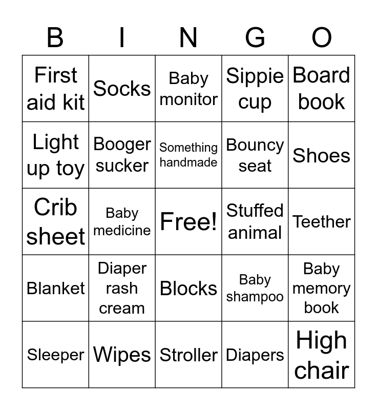This bingo card has a free space and 34 words: Bottle, Diapers, Onesie, Rattle, Blanket, Booger sucker, Board book, Sleeper, Socks, Pacifier, Something handmade, Baby monitor, Mobile, Outfit, Stuffed animal, Shoes, Wipes, Crib sheet, Diaper rash cream, Baby shampoo, Blocks, Formula, First aid kit, Teether, Stroller, High chair, Sippie cup, Diaper bag, Bouncy seat, Light up toy, Hangers, Baby medicine, Baby memory book and Boppie.