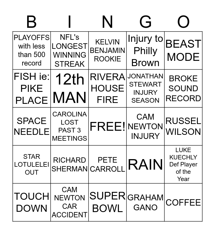This bingo card has a free space and 24 words: RICHARD SHERMAN, CAM NEWTON CAR ACCIDENT, RIVERA HOUSE FIRE, TOUCH DOWN, BEAST MODE, PLAYOFFS with less than 500 record, FISH ie: PIKE PLACE, NFL's LONGEST WINNING STREAK, CAM NEWTON INJURY, PETE CARROLL, JONATHAN STEWART INJURY SEASON, SPACE NEEDLE, RAIN, LUKE KUECHLY Def Player of the Year, 12th MAN, GRAHAM GANO, RUSSEL WILSON, KELVIN BENJAMIN ROOKIE, BROKE SOUND RECORD, CAROLINA LOST PAST 3 MEETINGS, COFFEE, STAR LOTULELEI OUT, Injury to Philly Brown and SUPER BOWL.