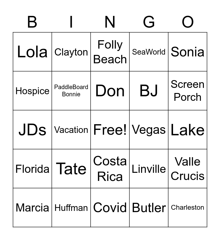 This bingo card has a free space and 24 words: Tate, Huffman, Don, Marcia, Sonia, Lola, Hospice, Clayton, Vegas, Costa Rica, BJ, JDs, Linville, Valle Crucis, PaddleBoard Bonnie, Butler, Lake, Folly Beach, Screen Porch, Vacation, Charleston, Florida, SeaWorld and Covid.
