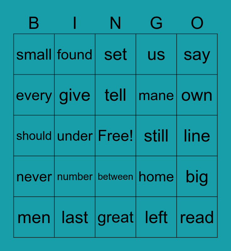 This bingo card has a free space and 25 words: number, great, tell, men, say, small, every, found, still, between, mane, should, home, big, give, air, line, set, own, under, read, last, never, us and left.
