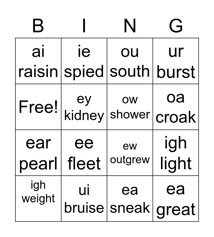 This bingo card has 16 words: ui bruise, igh light, ou south, ai raisin, ear pearl, ie spied, ew outgrew, ea sneak, Free!, ey kidney, igh weight, ur burst, ee fleet, oa croak, ow shower and ea great.