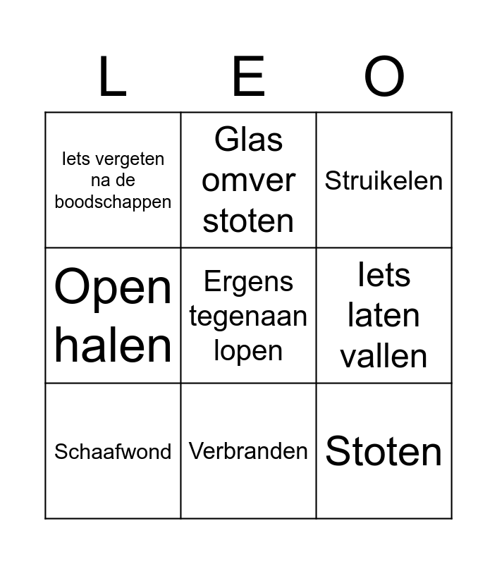 This bingo card has a free space and 8 words: Iets laten vallen, Struikelen, Glas omver stoten, Schaafwond, Iets vergeten na de boodschappen, Stoten, Open halen and Verbranden.