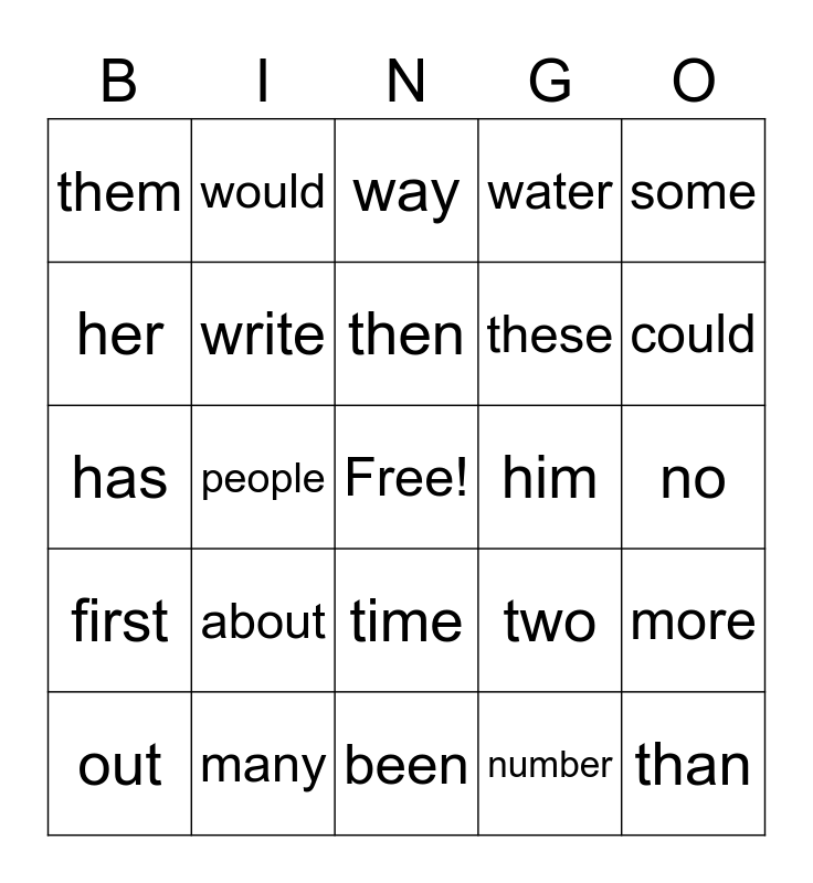 This bingo card has a free space and 24 words: about, many, then, out, some, them, her, would, him, time, these, has, two, more, write, number, no, way, could, people, than, first, water and been.