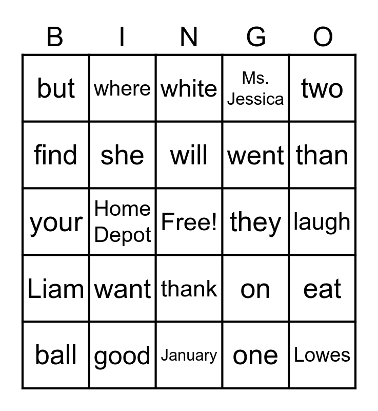 This bingo card has a free space and 24 words: want, good, will, ball, two, but, find, where, they, thank, went, your, on, eat, she, one, laugh, white, than, Home Depot, Lowes, Liam, Ms. Jessica and January.