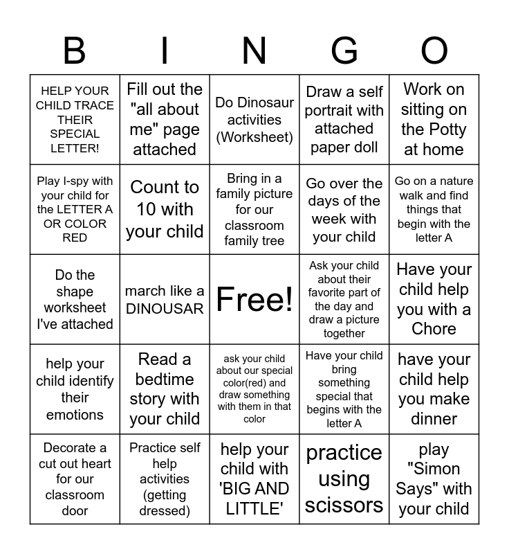 This bingo card has a free space and 24 words: Read a bedtime story with your child, Practice self help activities (getting dressed), Bring in a family picture for our classroom family tree, Decorate a cut out heart for our classroom door, Work on sitting on the Potty at home, HELP YOUR CHILD TRACE THEIR SPECIAL LETTER!, Play I-spy with your child for the LETTER A OR COLOR RED, Fill out the "all about me" page attached, Ask your child about their favorite part of the day and draw a picture together, ask your child about our special color(red) and draw something with them in that color, Go over the days of the week with your child, Do the shape worksheet I've attached, Have your child bring something special that begins with the letter A, have your child help you make dinner, Count to 10 with your child, practice using scissors, Have your child help you with a Chore, Do Dinosaur activities (Worksheet), Go on a nature walk and find things that begin with the letter A, march like a DINOUSAR, play "Simon Says" with your child, help your child identify their emotions, Draw a self portrait with attached paper doll and help your child with 'BIG AND LITTLE'.